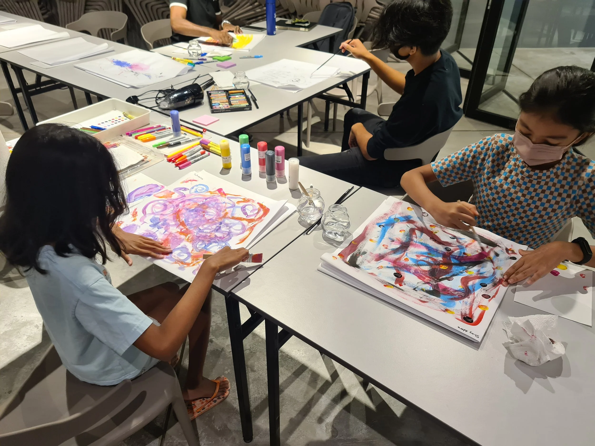 Workshops were heid where participants used mixed media like water based paint, crayons, oil pastels and charcoal to do some intuitive mark making and then after warming up, they produced mini abstracts. They created some pretty cool work!